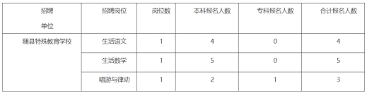 根據(jù)《關(guān)于隨縣縣直學(xué)校2023年度專項(xiàng)招聘教師公告》,隨縣縣直學(xué)校2023年度專項(xiàng)招聘教師43名,隨縣特殊教育學(xué)校共設(shè)3個(gè)崗位,其中生活語文1個(gè),生活數(shù)學(xué)1個(gè),唱游與律動(dòng)1個(gè)。因本科學(xué)歷報(bào)名人數(shù)不足1:3,可放寬至?茖W(xué)歷報(bào)名,現(xiàn)將相關(guān)情況予以公告。