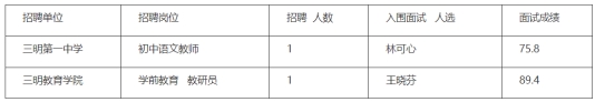根據(jù)《中共三明市委組織部三明市人力資源和社會保障局關(guān)于印發(fā)<三明市直事業(yè)單位選聘工作人員實施辦法(試行)的通知>》(明人發(fā)〔2019〕217號)、《中共三明市委三明市人民政府印發(fā)<關(guān)于促進基礎(chǔ)教育高質(zhì)量發(fā)展的若干措施>的通知》(明委發(fā)〔2019〕11號)、《三明市教育局關(guān)于三明市直屬學(xué)校公開選聘教師的通告》等文件規(guī)定,現(xiàn)將三明市部分直屬學(xué)校公開選聘教師面試成績予以公示,如有異議,請與三明市教育局人事科聯(lián)系。