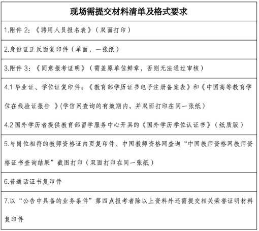 1.有效居民身份證、本科及以上畢業(yè)證、學(xué)位證、教師資格證、普通話證等證明材料(國〈境〉外留學(xué)回國人員還須提供教育部留學(xué)服務(wù)中心學(xué)歷學(xué)位認(rèn)證書)原件及復(fù)印件;