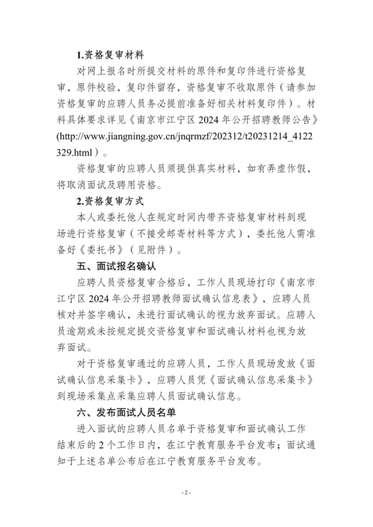 2024年關(guān)于南京市江寧區(qū)公開招聘教師資格復(fù)審和面試確認(rèn)的通知