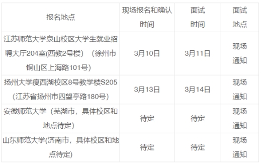 本次招聘在江蘇師范大學、揚州大學、安徽師范大學、山東師范大學等高校設立招聘點,采取網(wǎng)上報名、現(xiàn)場確認的方式進行。招聘點招聘崗位和人數(shù)隨招聘進程動態(tài)調(diào)整。前一招聘點已完成招聘計劃的崗位,招聘工作自然結束。前一招聘點未完成招聘計劃的崗位,后一招聘點繼續(xù)招聘剩余空缺崗位。本次各招聘點空缺崗位情況及后續(xù)相關招聘信息請及時關注濱?h教師發(fā)展中心官網(wǎng):https://bhjsfz.cn/。