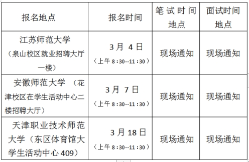 本次招聘在江蘇師范大學(泉山校區(qū))、安徽師范大學(花津校區(qū))、天津職業(yè)技術師范大學等地設招聘點,采取現(xiàn)場報名的方式。招聘點招聘崗位和人數(shù)隨招聘進程動態(tài)調整。前一招聘點已完成招聘計劃的崗位,招聘工作自然結束。前一招聘點未完成招聘計劃的崗位,后一招聘點繼續(xù)招聘剩余空缺崗位。