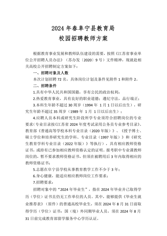 2024年春鹽城阜寧縣教育局校園招聘教師方案【72名】