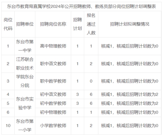 東臺(tái)市教育局直屬學(xué)校2024年公開(kāi)招聘教師、教練員報(bào)名工作已結(jié)束,因部分崗位報(bào)名資格審核合格人數(shù)未達(dá)開(kāi)考比例,根據(jù)公告要求,招聘計(jì)劃數(shù)與通過(guò)資格審核人數(shù)達(dá)不到比例的,相應(yīng)核減該崗位招聘計(jì)劃數(shù),直至取消該崗位招聘計(jì)劃,F(xiàn)予以調(diào)整(詳見(jiàn)附表)。
