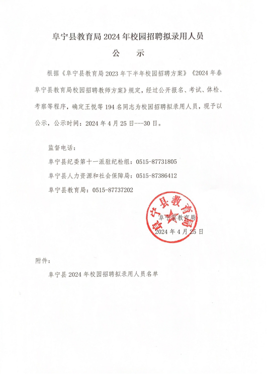 2024年鹽城阜寧縣教育局校園招聘擬錄用人員公示