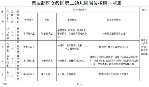 西咸新區(qū)文教園第二幼兒園崗位招聘一覽表