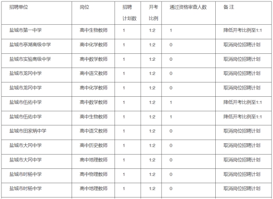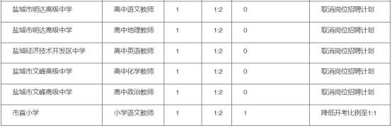 根據(jù)2024年5月6日發(fā)布的《江蘇省鹽城市教育局直屬學(xué)校2024年上半年公開(kāi)招聘優(yōu)秀畢業(yè)生公告》精神,截至5月16日下午18:00,已完成報(bào)名及資格審查,因部分崗位報(bào)名成功人數(shù)未達(dá)開(kāi)考比例,現(xiàn)擬降低部分崗位開(kāi)考比例至1:1,取消部分崗位招聘計(jì)劃,具體情況如下: