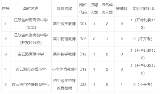 連云港市教育局直屬學(xué)校2024年公開招聘編制內(nèi)教師報名已經(jīng)結(jié)束。由于部分崗位報名人數(shù)沒有達到開考比例,按照《連云港市教育局直屬學(xué)校2024年公開招聘編制內(nèi)教師公告》要求,對相應(yīng)崗位進行了核減或降低開考比例,現(xiàn)將有關(guān)崗位說明如下: