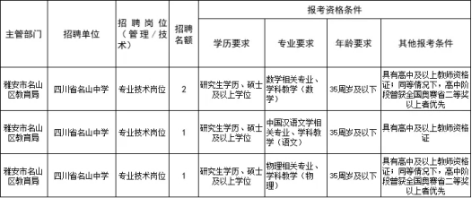 為加強人才隊伍建設,深入實施人才強市戰(zhàn)略,為加快建設川西教育中心提供堅強的人才支撐,根據(jù)《中共雅安市委組織部、雅安市人力資源和社會保障局關于雅安市2024年“雅州英才”工程赴外招才引智引進教育類高層次人才和急需緊缺專業(yè)人員的公告》,四川省名山中學計劃在2024年通過“雅州英才”工程直接考核招聘教師4人。