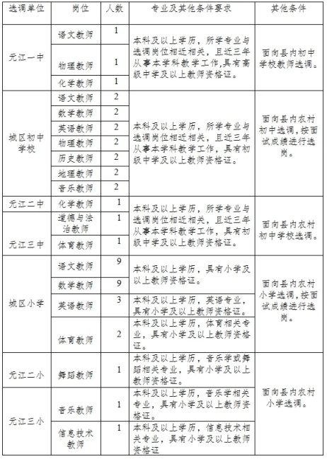 為加強(qiáng)教師隊(duì)伍建設(shè),進(jìn)一步優(yōu)化教師資源配置,根據(jù)《元江縣機(jī)關(guān)事業(yè)單位工作人員轉(zhuǎn)任(調(diào)動(dòng))管理規(guī)定》(元改委發(fā)〔2024〕3號(hào))、《元江縣教師流動(dòng)調(diào)配辦法(試行)》(元教體黨組發(fā)〔2024〕3號(hào))精神,現(xiàn)將2024年公開(kāi)選調(diào)縣內(nèi)城區(qū)學(xué)校教師通知如下: