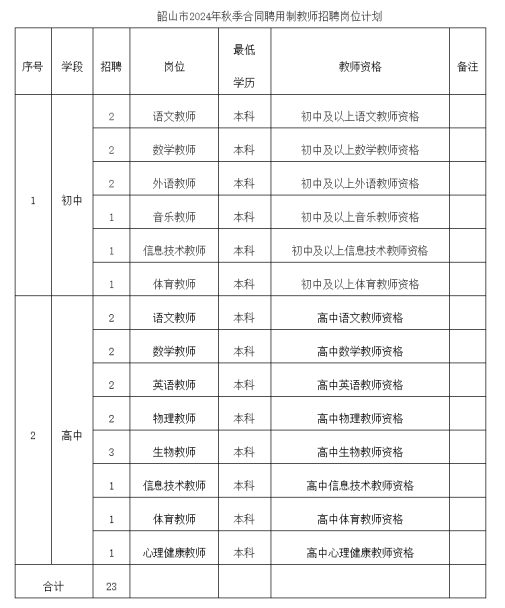 附件:韶山市2024年秋季合同聘用制教師招聘崗位計(jì)劃