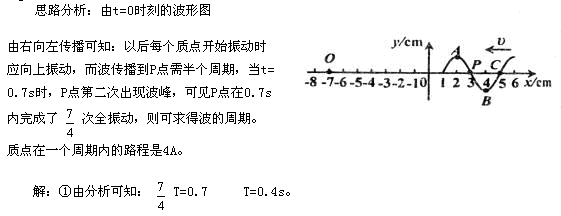 例題2、一列簡(jiǎn)諧橫波,在t=0時(shí)波形如圖7—8所示,P、Q兩點(diǎn)的坐標(biāo)分別為-1m、-7m,波的傳播方向由右向左,已知t=0.7s時(shí),P點(diǎn)第二次出現(xiàn)波峰,則:①此波的周期是多少?②此波的波長(zhǎng)是多少?③當(dāng)t=1.2s時(shí)P點(diǎn)的位移?④從t=0到t=1.2s質(zhì)點(diǎn)P的路程是多少?