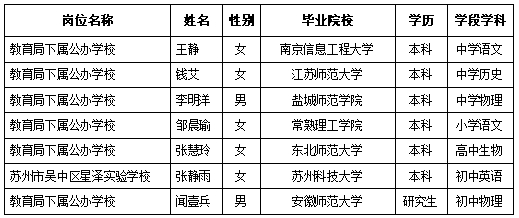 根據(jù)《2024年蘇州市吳中區(qū)教育局公開招聘中小學教師公告》的規(guī)定,經(jīng)公開報名、筆試、面試、體檢和考察等程序,擬錄用以下7名同志,現(xiàn)予以公示,公示時間為2024年7月25日至2024年8月2日。