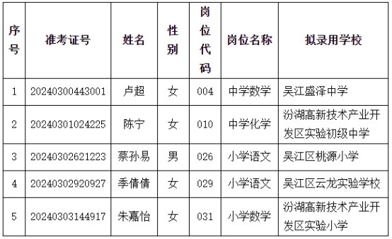 根據(jù)《2024年蘇州市吳江區(qū)教育系統(tǒng)第二次公開招聘事業(yè)編制教師公告》,經(jīng)過(guò)考試、體檢、考核(政審)等程序,以下擬聘用人員予以公示。