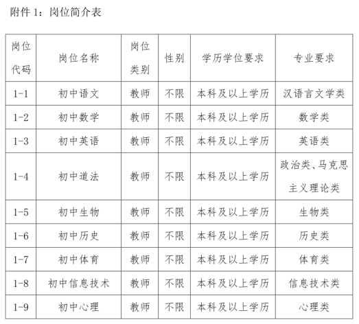 招聘崗位:語文、數(shù)學(xué)、英語、道法、生物、歷史、體育、信息技術(shù)、心理
