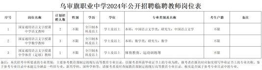 烏審旗職業(yè)中學(xué)始建于1987年,是全旗唯一一所以全日制辦學(xué)為主,集職業(yè)技術(shù)教育、技工教育、社會培訓(xùn)、職業(yè)技能認(rèn)定為一體的綜合性職業(yè)中學(xué)。因教育教學(xué)工作需要,現(xiàn)面向社會公開招聘語文教師2名、數(shù)學(xué)教師3名、體育教師(足球方向)1名,有關(guān)事項公告如下: