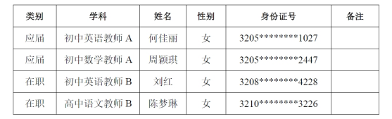 根據(jù)《2024年蘇州高新區(qū)教育系統(tǒng)公開招聘事業(yè)編制教師公告》要求,經過報名、考試、體檢和政審,擬錄用何佳麗等同志,現(xiàn)公示如下: