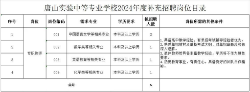 詳見《唐山實驗中等專業(yè)學(xué)校2024年度補充招聘崗位目錄》