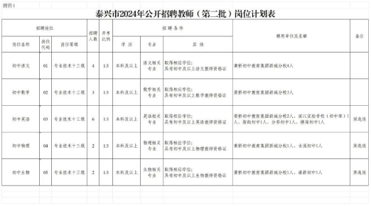 1.泰興市2024年公開招聘教師(第二批)崗位計(jì)劃表