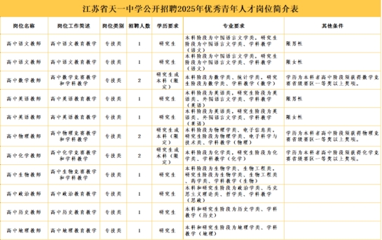 為選拔優(yōu)秀人才,優(yōu)化人員結(jié)構(gòu),充實我校教師隊伍,經(jīng)研究核準(zhǔn),江蘇省天一中學(xué)面向全國招聘優(yōu)秀青年人才14名(語文2、數(shù)學(xué)2、英語2、物理2、化學(xué)2、生物1、政治1、歷史1、地理1),具體要求見下表: