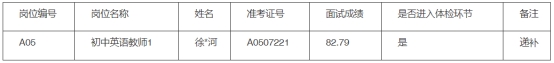 根據(jù)《無錫高新區(qū)(新吳區(qū))教育系統(tǒng)2025年引進優(yōu)秀青年人才公告(一)》(錫人社事招公告?zhèn)洹?024〕78號)精神,因部分考生放棄在我區(qū)的擇業(yè)資格,按照報考同一崗位的人員,面試成績從高到低依次遞補的原則,現(xiàn)有以下考生遞補進入體檢環(huán)節(jié):