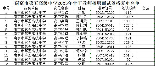 根據(jù)《江蘇省事業(yè)單位公開招聘人員辦法》(蘇辦發(fā)[2020]9號(hào))、關(guān)于印發(fā)《江蘇省事業(yè)單位公開招聘人員面試暫行辦法》的通知(蘇人社發(fā)[2013]325號(hào)),依據(jù)2024年12月17日發(fā)布的《南京市秦淮區(qū)教育局所屬學(xué)校2025年公開招聘教師公告》(秦事招公告﹝2024﹞5號(hào)),現(xiàn)將進(jìn)入資格復(fù)審人員名單公告如下: