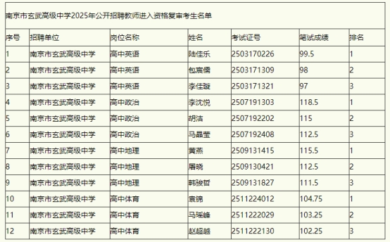 《南京市玄武高級(jí)中學(xué)2025年公開招聘教師進(jìn)入資格復(fù)審考生名單》(附件)