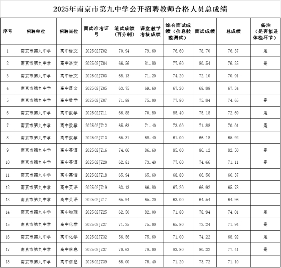 根據(jù)《南京市玄武區(qū)教育局所屬學(xué)校2025年公開招聘教師公告》(玄事招公告(R)﹝2024﹞3號)要求,南京市第九中學(xué)已于2025年1月18日、2025年2月20日完成了筆試、面試工作,現(xiàn)將進(jìn)入面試合格人員總成績予以公布。