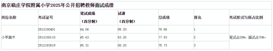 根據(jù)《南京市教育局直屬學校2025年公開招聘教師公告》寧事招公告(R)〔2024〕40號的要求,現(xiàn)將參加我校面試的考生成績予以公布。如有異議,請于公示期間提出。