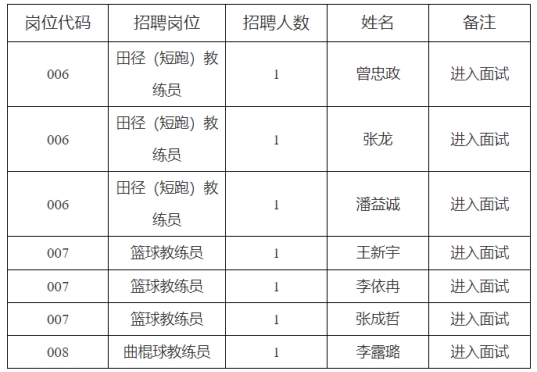根據(jù)《2025年蘇州市教育系統(tǒng)公開招聘中小學(xué)體育教練員公告》,經(jīng)報名、資格初審和筆試等程序,現(xiàn)將入圍資格復(fù)審及面試工作的人員名單公示如下。
