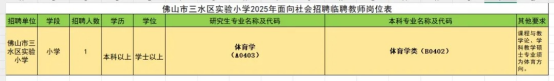 佛山市三水區(qū)實驗小學(xué)為三水區(qū)政府直屬公益一類事業(yè)單位,根據(jù)學(xué)校發(fā)展和需要,擬面向社會公開招聘體育合同制教師1名。本次招聘的臨聘教師為三水區(qū)直屬學(xué)校非編制內(nèi)人員,入職后從事學(xué)校教育教學(xué)工作,享受三水區(qū)有關(guān)臨聘教師政策規(guī)定的薪酬待遇。