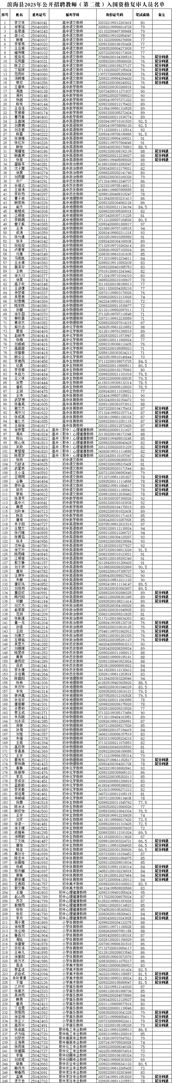 根據(jù)《濱?h2025年公開招聘教師(第二批)公告》精神,經(jīng)資格初審、組織筆試,現(xiàn)將進(jìn)入資格復(fù)審人員及其筆試成績(jī)予以公布(見附件)。
