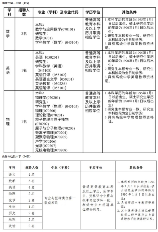 5.專業(yè)要求:具有高中教師資格證,所學(xué)專業(yè)、資格證專業(yè)與報考崗位需一致(焦作市弘致中學(xué)相近專業(yè)由招聘單位綜合判定);其中報考語文崗位者需取得二級甲等及以上普通話水平測試等級證書,2025屆畢業(yè)生需在2025年7月31日前取得相應(yīng)教師資格證書;