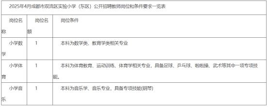 具體崗位和條件見《2025年成都市雙流區(qū)實驗小學(xué)(東區(qū))公開招聘教師崗位和條件要求一覽表》