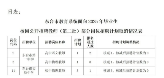 東臺市教育系統(tǒng)面向2025年畢業(yè)生校園公開招聘教師(第二批)報名工作已于5月12日17時結(jié)束。根據(jù)《東臺市教育系統(tǒng)面向2025年畢業(yè)生校園公開招聘教師公告(第二批)》的要求,部分招聘崗位未達到開考比例,現(xiàn)予以取消(詳見附表)。