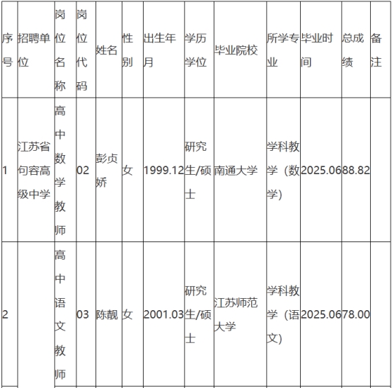 根據(jù)《句容市教育局所屬學(xué)校2025年第一批校園公開(kāi)招聘教師公告》(鎮(zhèn)句事招公告〔2024〕8號(hào))經(jīng)資格審查、面試、體檢和考察,現(xiàn)將句容市教育局所屬學(xué)校2025年第一批校園招聘擬聘用人員名單予以公示,公示時(shí)間2025年8月25日-9月2日。