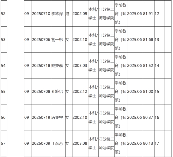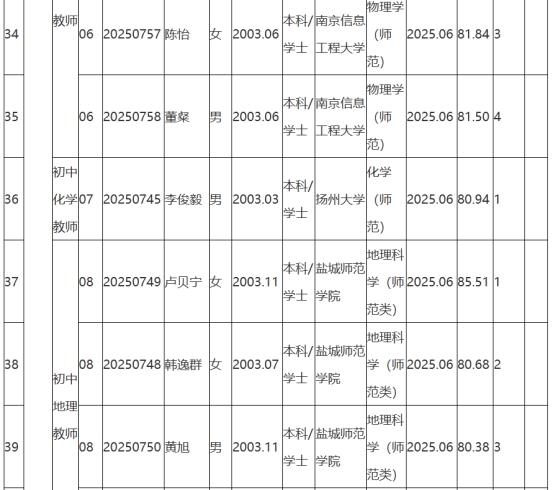 根據(jù)《2025年句容市教育局面向鄉(xiāng)村定向師范生公開招聘教師公告》(鎮(zhèn)句事招公告〔2025〕6號)經(jīng)資格審查、學(xué)業(yè)水平測試、體檢和考察,現(xiàn)將2025年句容市教育局面向鄉(xiāng)村定向師范生公開招聘教師擬聘用人員名單予以公示,公示時(shí)間2025年8月25日-9月2日。