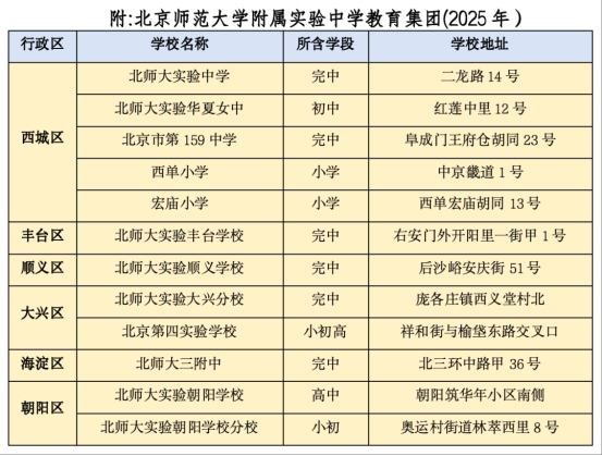 北京師范大學(xué)附屬實(shí)驗(yàn)中學(xué),創(chuàng)建于1917年,前身為北師大女附中。學(xué)校是新課程新教材實(shí)施國(guó)家級(jí)示范校、北京市首批示范高中校,是教育部和北師大進(jìn)行教育改革的實(shí)驗(yàn)基地,是培養(yǎng)優(yōu)秀中學(xué)生的搖籃。學(xué)校屢獲北京市“全面育人,辦有特色”先進(jìn)學(xué)校、全國(guó)十佳科技校、全國(guó)健康促進(jìn)金牌校、全國(guó)傳統(tǒng)運(yùn)動(dòng)項(xiàng)目先進(jìn)校、北京市教育科學(xué)研究先進(jìn)校、北京市金鵬科技團(tuán)、北京市金帆舞蹈團(tuán)等殊榮,在課程建設(shè)、中高考成績(jī)、素質(zhì)教育、出國(guó)留學(xué)等領(lǐng)域,在北京市乃至全國(guó)均享有極高的社會(huì)聲譽(yù)。