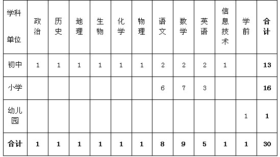 擬招聘教師30人,其中初中13人、小學(xué)16人、幼兒園1人,具體崗位(學(xué)科)和計(jì)劃如下: