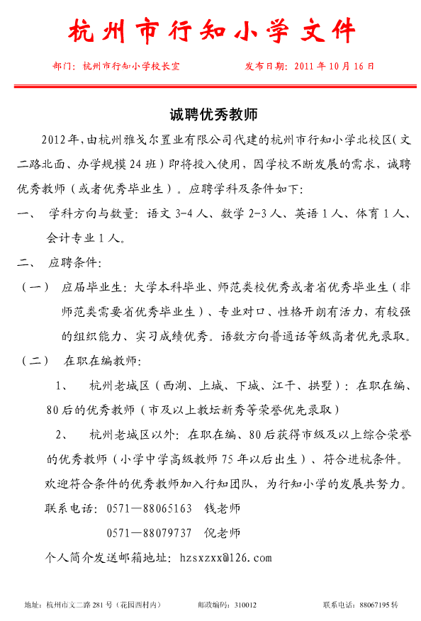 浙江省杭州市行知小學(xué)2012年6月誠(chéng)聘優(yōu)秀教師