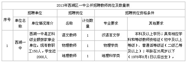 。ㄒ唬┕_報(bào)名:采取現(xiàn)場報(bào)名的方式進(jìn)行。應(yīng)聘人員須攜帶本人有效身份證、學(xué)歷和學(xué)位證書、教師資格證、普通話等級(jí)證原件及復(fù)印件,本人近期一寸免冠照片3張到西湖管理區(qū)教科文局報(bào)名(西湖鎮(zhèn)教育路農(nóng)貿(mào)市場旁社保大樓二樓)。在職人員應(yīng)持原單位出具的同意報(bào)考證明報(bào)考。報(bào)名時(shí)須如實(shí)填寫《湖南省事業(yè)單位招聘人員報(bào)名表》。報(bào)名時(shí)間為3天,從8月30日至9月1日。