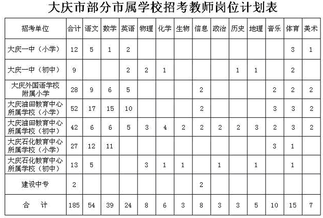 計(jì)劃招考185人。其中,大慶油田教育中心所屬中小學(xué)94人、大慶石化教育中心所屬中小學(xué)40人、大慶一中所屬中小學(xué)21人、大慶外國(guó)語學(xué)校附屬小學(xué)28人、大慶建設(shè)中專2人(具體崗位見招考教師崗位計(jì)劃表)。