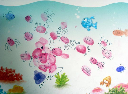 -老師告訴孩子們印手印的方法。(做示范。)老師印出魚的身體。