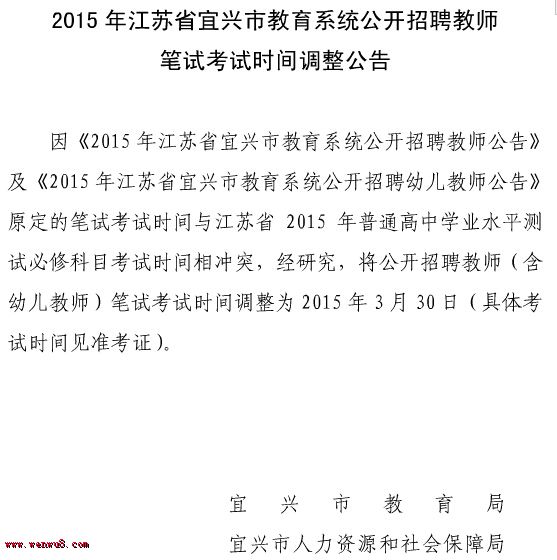 2015年江蘇省宜興市教師招聘筆試考試時(shí)間調(diào)整公告