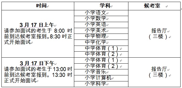 二、面試主要以講課的形式進(jìn)行,測試考生的板書能力、語言能力、邏輯思維能力、應(yīng)變能力和儀態(tài)儀表等教師基本素質(zhì)。報(bào)考音樂、體育、美術(shù)學(xué)科的考生還需測試專業(yè)技能(相關(guān)專業(yè)器材請(qǐng)自備),報(bào)考計(jì)算機(jī)學(xué)科的考生還需測試上機(jī)實(shí)操能力。