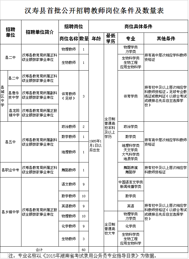 我縣教育系統(tǒng)擬面向社會公開招聘教師60名,其中:縣二中教師3名,縣五中教師4名,縣職業(yè)中專教師1名,詹樂貧中學教師1名、龍陽鎮(zhèn)中學教師1名、鄉(xiāng)鎮(zhèn)中學教師50名。凡符合報名條件人員均可報名應聘。
