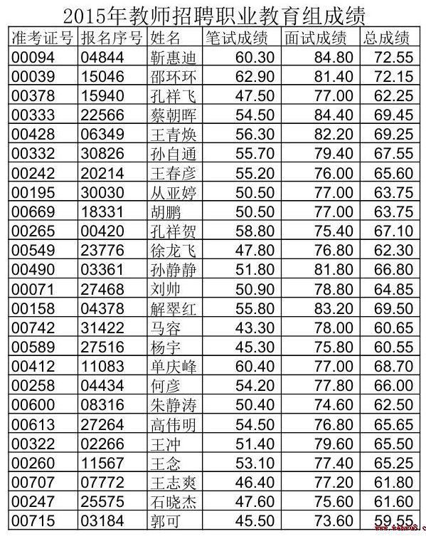 根據(jù)《巨野縣2015年教師招聘簡(jiǎn)章》規(guī)定,經(jīng)過筆試、面試,現(xiàn)將職業(yè)教育組考生總成績(jī)公示如下。