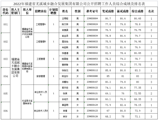 根據(jù)《福建省尤溪城鄉(xiāng)融合發(fā)展集團(tuán)有限公司2022年公開(kāi)招聘國(guó)有企業(yè)人員公告》,現(xiàn)將福建省尤溪城鄉(xiāng)融合發(fā)展集團(tuán)有限公司2022年公開(kāi)招聘國(guó)有企業(yè)人員的綜合成績(jī)及排名情況予以公布,詳見(jiàn)附件。