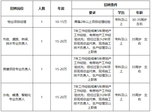 此次共招聘4名人員,分別為物業(yè)項(xiàng)目經(jīng)理1人,市政、道路、橋梁、排水專業(yè)負(fù)責(zé)人1人、房建項(xiàng)目專業(yè)負(fù)責(zé)人1人,水電、暖通、智能化專業(yè)負(fù)責(zé)人1人。