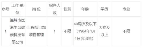 溫嶺市醫(yī)港生命健康科技有限公司為市市場集團所屬功能類企業(yè),主要負責醫(yī)學研究和試驗發(fā)展;第一類醫(yī)療器械生產(chǎn);技術(shù)服務、技術(shù)開發(fā)、技術(shù)咨詢、技術(shù)交流、技術(shù)轉(zhuǎn)讓、技術(shù)推廣;健康咨詢服務(不含診療服務);園區(qū)管理服務;信息技術(shù)咨詢服務;第一類醫(yī)療器械銷售;軟件開發(fā);第一類醫(yī)療器械租賃;機械設備租賃;非居住房地產(chǎn)租賃等。因經(jīng)營發(fā)展需要,擬面向社會公開招聘編外工作人員,現(xiàn)將有關(guān)事項公告如下:
